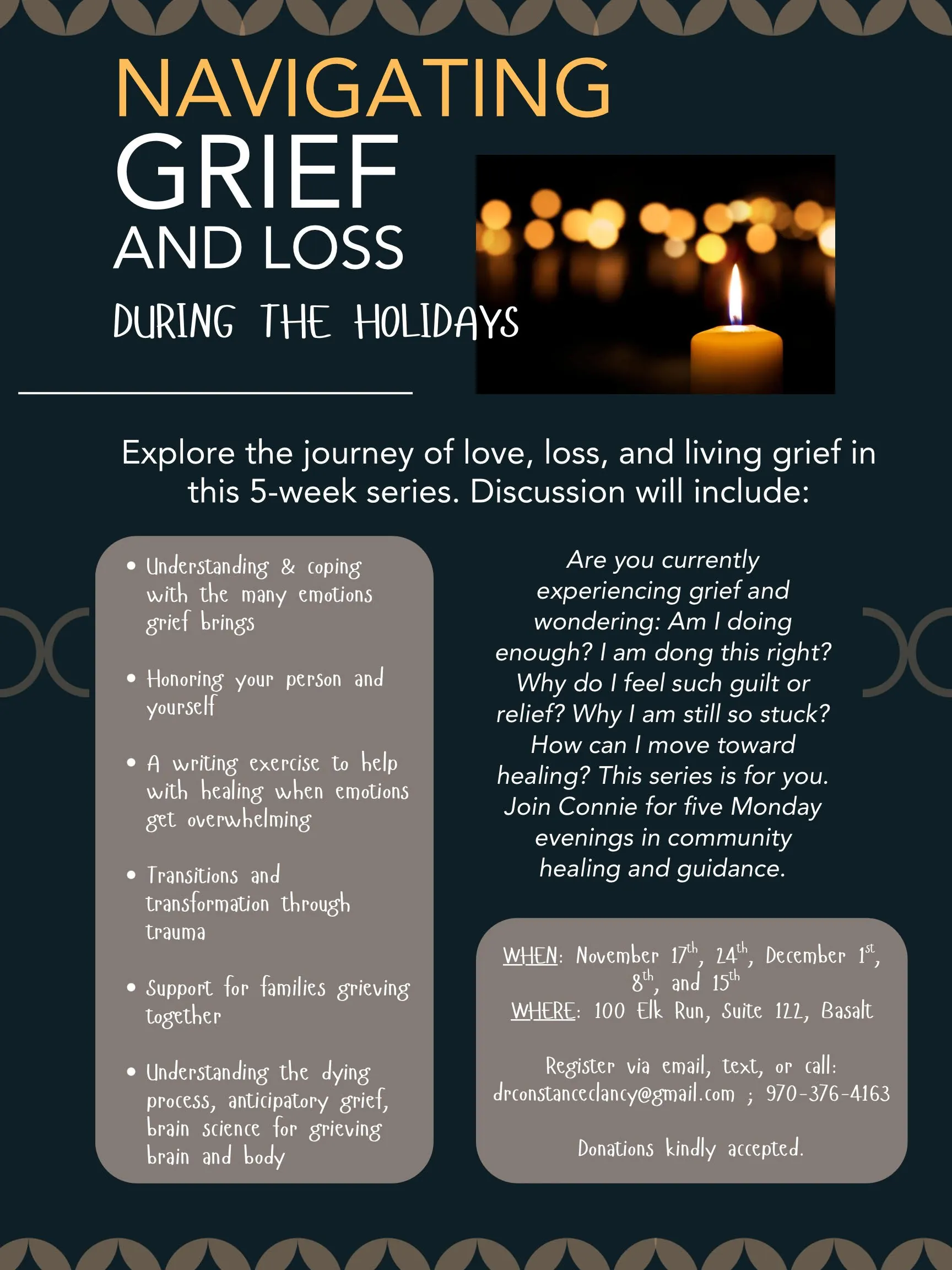 A 5-week series to explore the journey of love, loss and living in grief. Supportive tools for navigating and processing grief, including within family and relational dynamics. Hosted by Dr. Connie Clancy in Basalt.